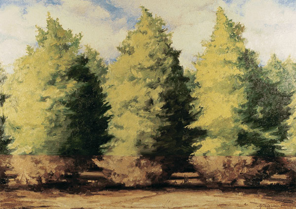 North Carolina artist J. Chris Wilson\‘s Landscape Painting Floodline on Cedars see also "From Murphy to Manteo—An Artist\‘s Scenic Journey"